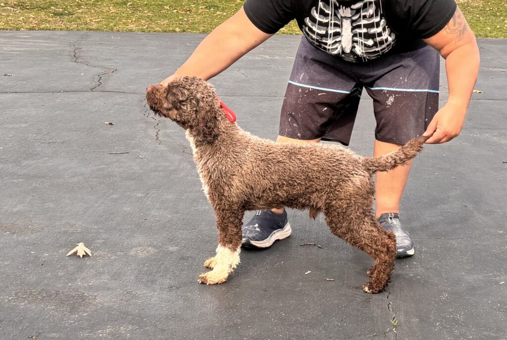 Ottavia is an incredibly calm and affectionate Lagotto who doesn’t meet a stranger. She welcomes each visitor with a tail wag and thinks everyone is coming to give her cuddles. Oti sleeps with our children and is an irreplaceable companion to our entire family. Before mothering her puppies, she had excellence presence in the ring and quickly earned AKC Grand Champion title, a reflection of her outstanding structure, temperament, and movement. Now as a first-time mom, she has surpassed our expectations. She has been patient, attentive, and nurturing. She has given her puppies remarkable care from the beginning.